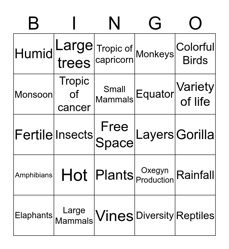 This bingo card has a free space and 24 words: Hot, Large Mammals, Small Mammals, Elaphants, Colorful Birds, Humid, Monsoon, Large trees, Layers, Plants, Equator, Fertile, Oxegyn Production, Rainfall, Tropic of cancer, Diversity, Gorilla, Tropic of capricorn, Variety of life, Insects, Reptiles, Amphibians, Monkeys and Vines.