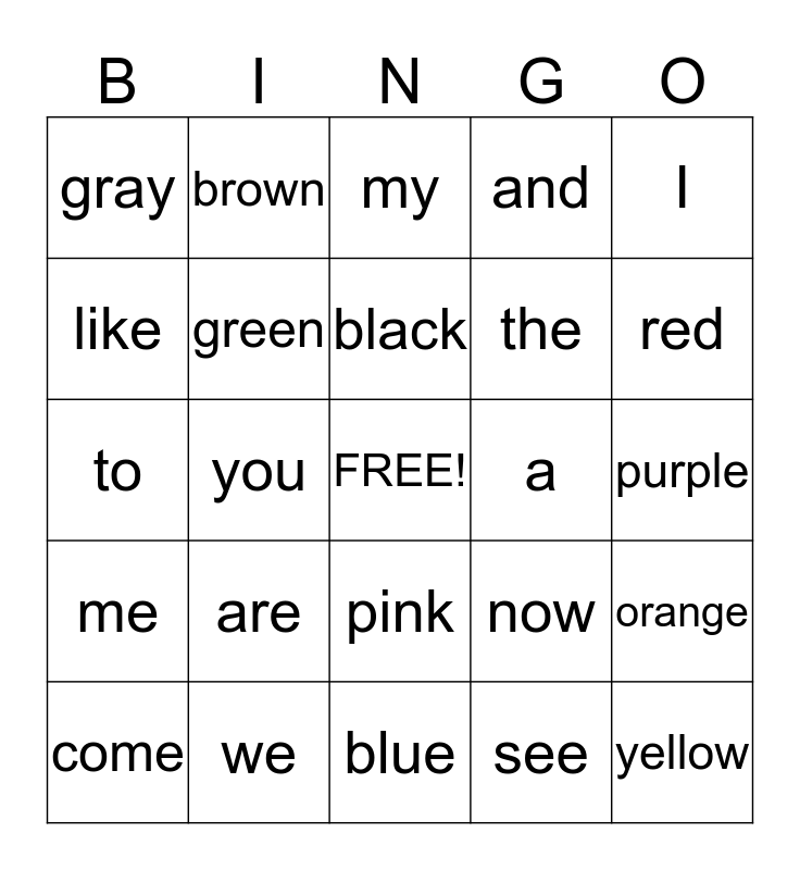 This bingo card has a free space and 24 words: are, we, black, come, I, gray, like, brown, a, pink, the, to, now, orange, green, see, purple, my, red, you, yellow, me, and and blue.