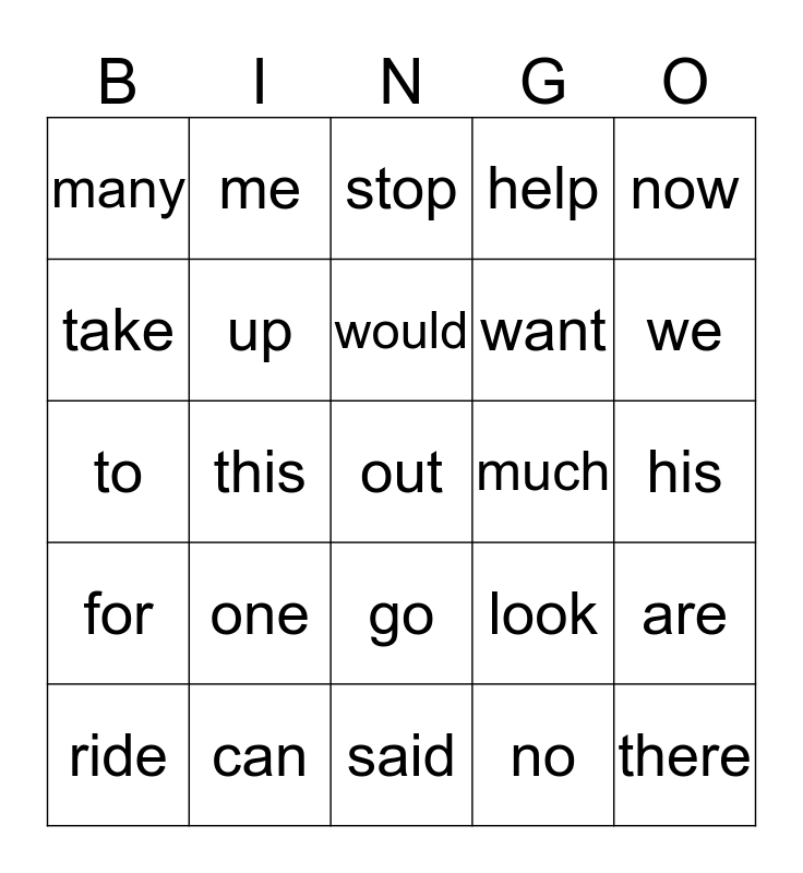 This bingo card has 25 words: one, said, would, ride, now, many, take, me, much, go, want, to, look, are, up, there, his, stop, we, this, out, can, for, help and no.