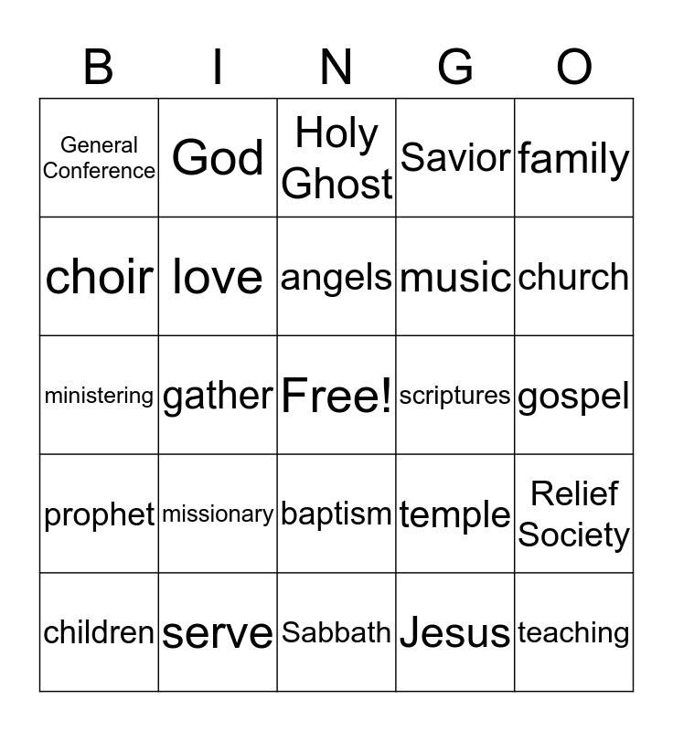 This bingo card has a free space and 34 words: spirit, Jesus, apostle, Joseph Smith, prophet, love, family, children, God, President Nelson, angels, Holy Ghost, Book of Mormon, Bible, scriptures, church, serve, ministering, missionary, temple, baptism, sacrament, General Conference, gospel, Sabbath, teaching, Savior, home, music, choir, Lord, gather, Relief Society and Priesthood.