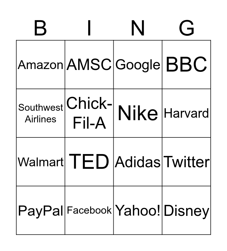 This bingo card has 16 words: Facebook, Twitter, Google, Amazon, Walmart, AMSC, Adidas, Yahoo!, Southwest Airlines, Chick-Fil-A, PayPal, BBC, TED, Harvard, Nike and Disney.