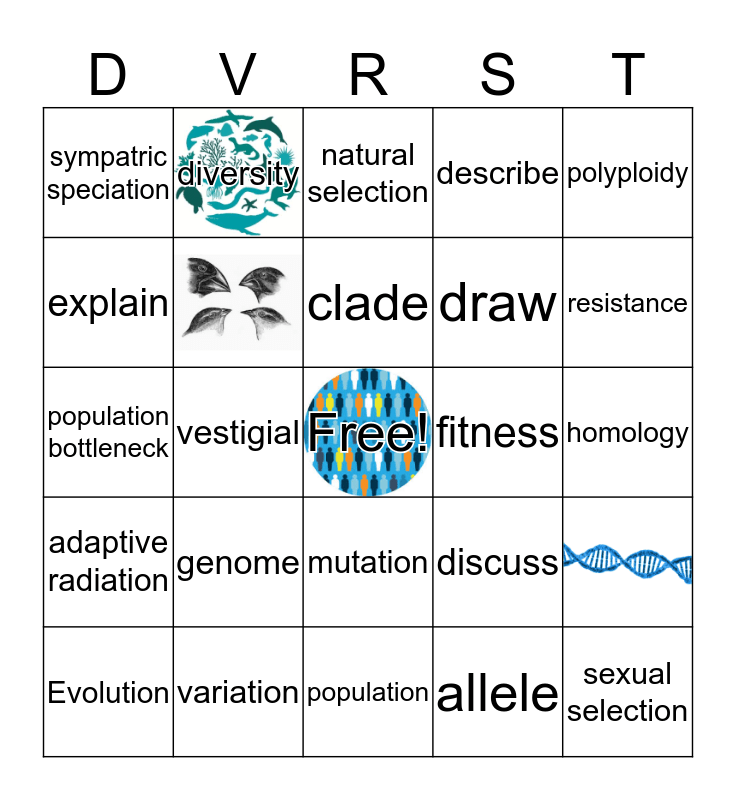 This bingo card has 4 images, a free space and 26 words: Evolution, gene pool, vestigial, allopatric speciation, sympatric speciation, natural selection, genome, fitness, variation, homology, sexual selection, population, allele, resistance, ancestor, mutation, adaptive radiation, polyploidy, population bottleneck, discuss, interpret, draw, explain, describe, diversity and clade.