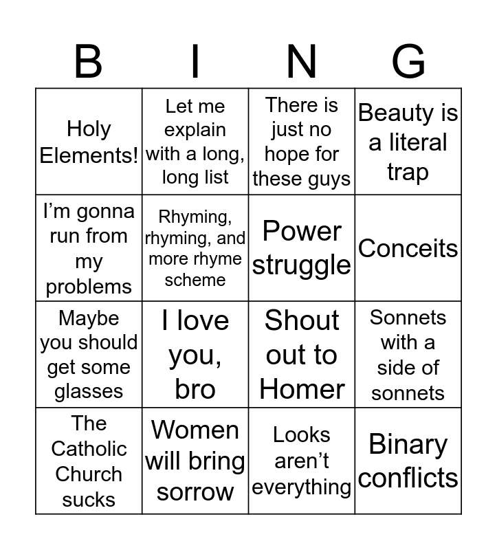 This bingo card has 16 words: Women will bring sorrow, Sonnets with a side of sonnets, There is just no hope for these guys, Holy Elements!, Maybe you should get some glasses, Let me explain with a long, long list, Shout out to Homer, Looks aren’t everything, I’m gonna run from my problems, Rhyming, rhyming, and more rhyme scheme, The Catholic Church sucks, Beauty is a literal trap, I love you, bro, Conceits, Power struggle and Binary conflicts.