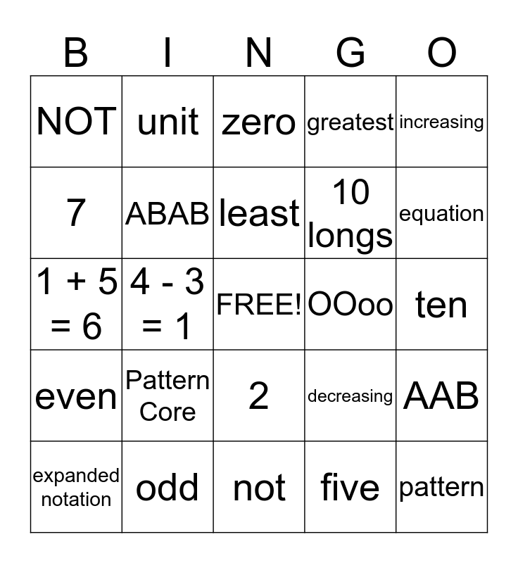 This bingo card has a free space and 24 words: Pattern Core, odd, least, expanded notation, increasing, NOT, 7, unit, OOoo, 2, 10 longs, 1 + 5 = 6, decreasing, AAB, ABAB, five, ten, zero, equation, 4 - 3 = 1, pattern, even, greatest and not.