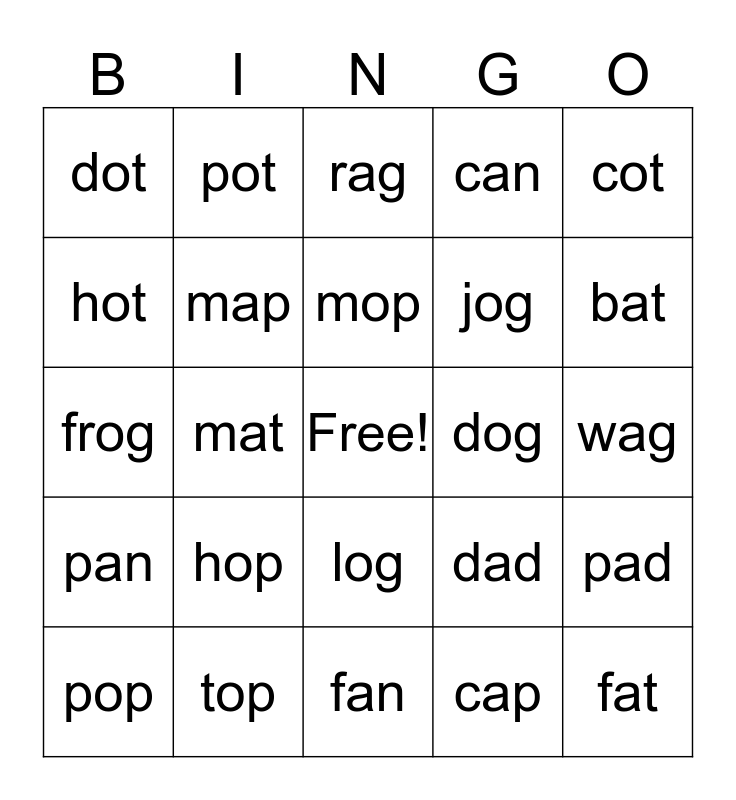 This bingo card has a free space and 24 words: hop, top, mop, pop, cot, dot, hot, pot, dog, log, jog, frog, dad, pad, map, cap, wag, rag, bat, mat, fat, pan, can and fan.