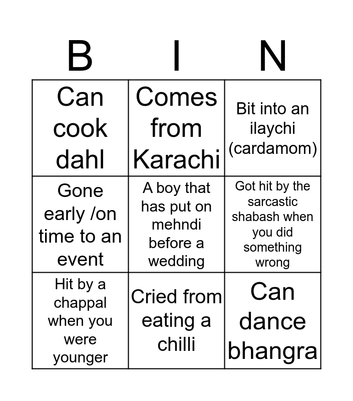 This bingo card has a free space and 8 words: Got hit by the sarcastic shabash when you did something wrong, Bit into an ilaychi (cardamom), Comes from Karachi, Hit by a chappal when you were younger, Can cook dahl, Can dance bhangra, Gone early /on time to an event and Cried from eating a chilli.