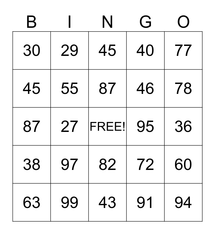 This bingo card has a free space and 24 words: 97, 99, 87, 63, 77, 30, 45, 29, 95, 82, 46, 87, 72, 60, 55, 91, 36, 45, 78, 27, 94, 38, 40 and 43.
