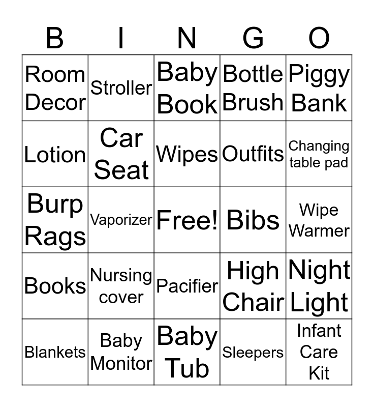 This bingo card has a free space and 34 words: Bottle, Sleepers, Diapers, Sippy cup, Books, Car Seat, Piggy Bank, Blankets, Stroller, onesies, Wipes, Baby Book, Diaper Bag, Money, Bibs, Changing table pad, Baby Monitor, Burp Rags, Nursing cover, High Chair, Pacifier, Soap Shampoo, Room Decor, Wipe Warmer, Baby Tub, Infant Care Kit, Bottle Brush, Gift Card, Outfits, Lotion, Baby Proofing Items, Vaporizer, Night Light and Baby soothing Machine.