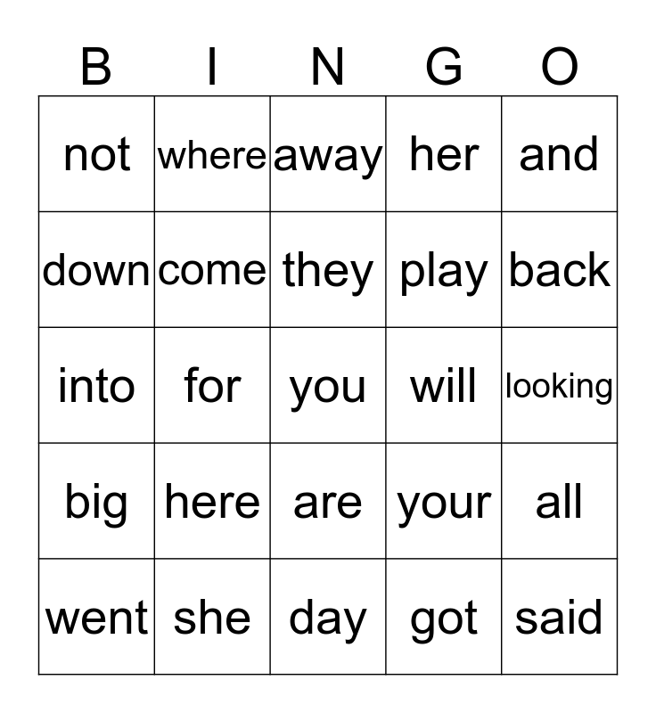This bingo card has 25 words: here, day, they, went, and, not, down, where, will, are, play, into, your, all, come, said, looking, away, back, for, you, she, big, her and got.