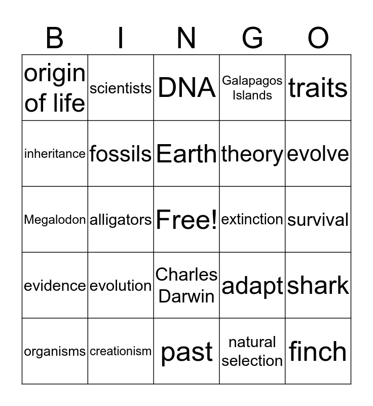 This bingo card has a free space and 24 words: evolution, creationism, Earth, organisms, traits, origin of life, inheritance, scientists, extinction, Charles Darwin, theory, Megalodon, adapt, shark, fossils, natural selection, survival, DNA, evolve, alligators, finch, evidence, Galapagos Islands and past.