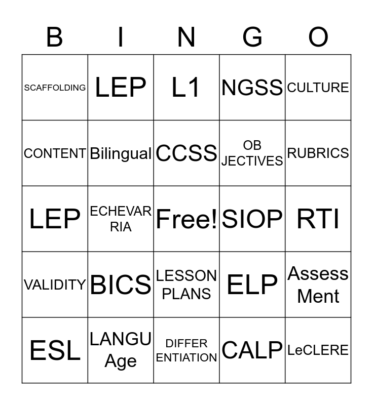 This bingo card has a free space and 24 words: ESL, BICS, CCSS, CALP, CULTURE, SCAFFOLDING, LEP, L1, SIOP, RTI, LEP, Bilingual, ELP, Assess Ment, CONTENT, LANGU Age, DIFFER ENTIATION, NGSS, RUBRICS, VALIDITY, ECHEVAR RIA, LESSON PLANS, OB JECTIVES and LeCLERE.