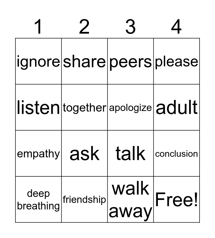 This bingo card has 21 words: friendship, conflict, share, roleplay, walk away, apologize, ignore, peers, talk, adult, empathy, please, Free!, stop, together, rules, deep breathing, ask, listen, conclusion and follow.
