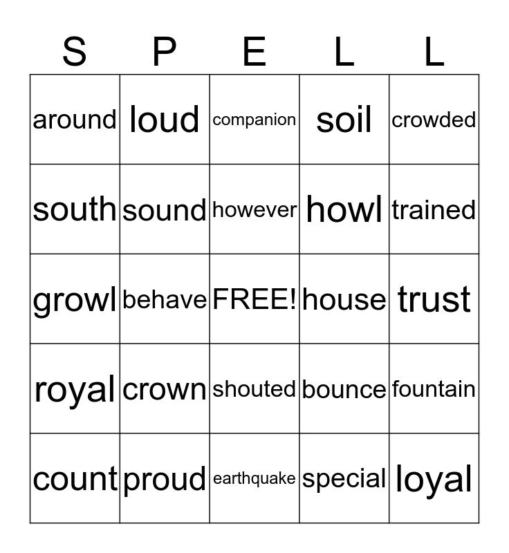 This bingo card has a free space and 24 words: crown, proud, however, count, crowded, around, south, loud, house, shouted, howl, growl, bounce, fountain, sound, special, trust, companion, trained, behave, loyal, royal, soil and earthquake.