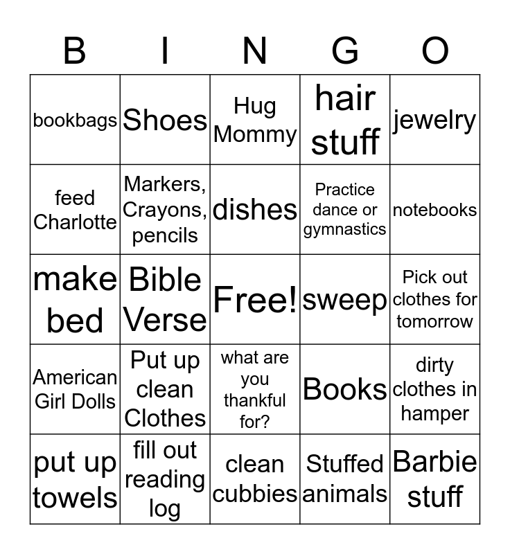 This bingo card has a free space and 24 words: Put up clean Clothes, fill out reading log, dishes, put up towels, jewelry, bookbags, feed Charlotte, Shoes, sweep, what are you thankful for?, Practice dance or gymnastics, make bed, Books, dirty clothes in hamper, Markers, Crayons, pencils, Stuffed animals, Pick out clothes for tomorrow, Hug Mommy, notebooks, Bible Verse, Barbie stuff, American Girl Dolls, hair stuff and clean cubbies.