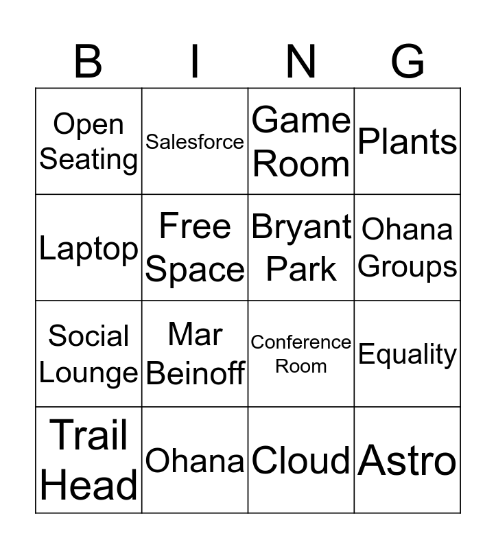 This bingo card has 16 words: Ohana, Equality, Game Room, Open Seating, Social Lounge, Salesforce, Conference Room, Cloud, Laptop, Free Space, Trail Head, Plants, Mar Beinoff, Ohana Groups, Bryant Park and Astro.