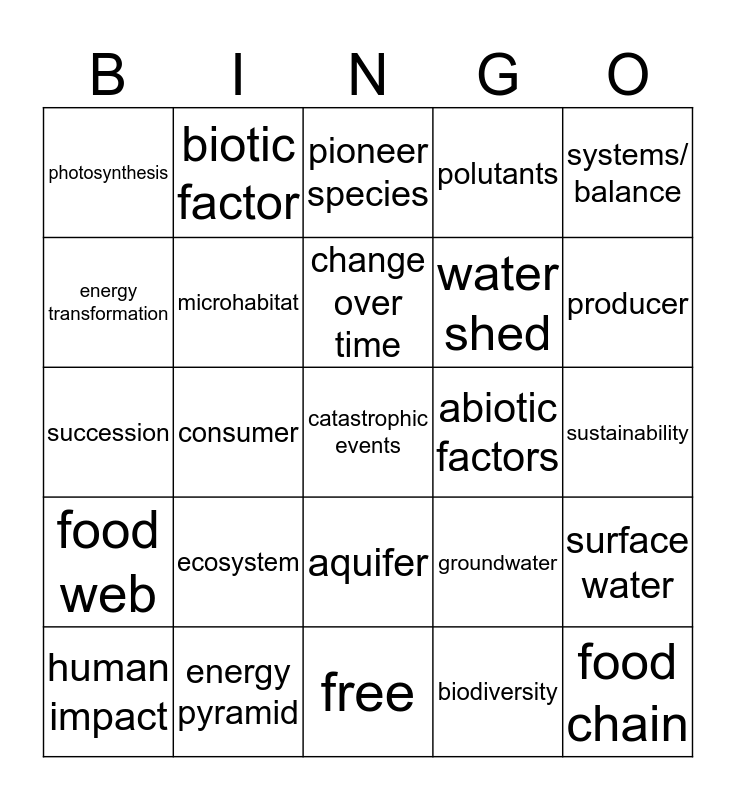 This bingo card has a free space and 24 words: ecosystem, energy pyramid, change over time, human impact, systems/ balance, photosynthesis, energy transformation, biotic factor, abiotic factors, aquifer, water shed, succession, groundwater, surface water, microhabitat, biodiversity, sustainability, pioneer species, producer, consumer, food chain, food web, polutants and free.
