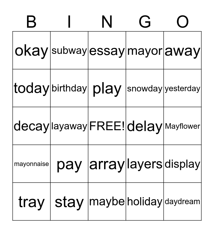 This bingo card has a free space and 24 words: pay, stay, play, tray, away, okay, today, subway, delay, array, snowday, decay, layers, display, birthday, holiday, Mayflower, essay, yesterday, layaway, daydream, mayonnaise, mayor and maybe.