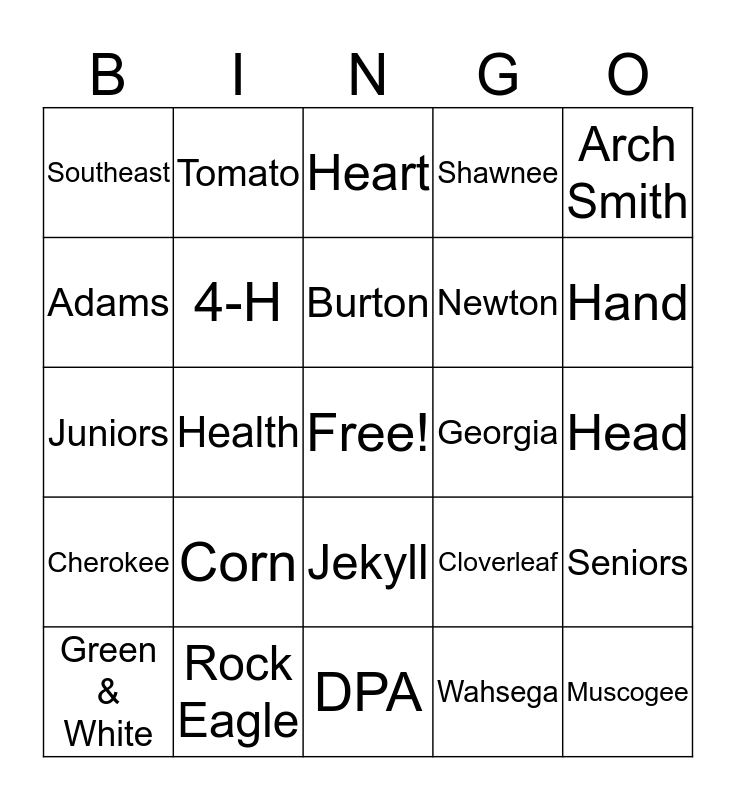 This bingo card has a free space and 24 words: Corn, Rock Eagle, Burton, Green & White, Arch Smith, Southeast, Adams, Tomato, Georgia, Jekyll, Newton, Juniors, Cloverleaf, Seniors, 4-H, Wahsega, Head, Heart, Hand, Health, Muscogee, Cherokee, Shawnee and DPA.