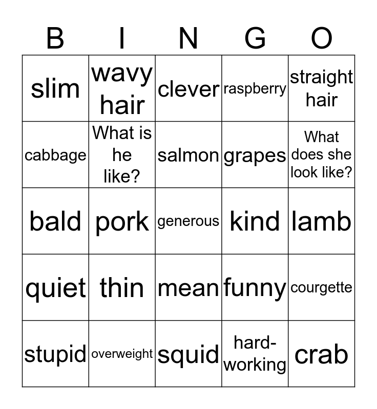This bingo card has a free space and 34 words: curly hair, hard-working, lazy, talkative, quiet, What is he like?, straight hair, stupid, wavy hair, beard, salmon, clever, shy, moustache, kind, What does she look like?, overweight, bald, thin, funny, mean, serious, slim, lamb, squid, crab, raspberry, green beans, grapes, cabbage, beef, pork, courgette and beetroot.