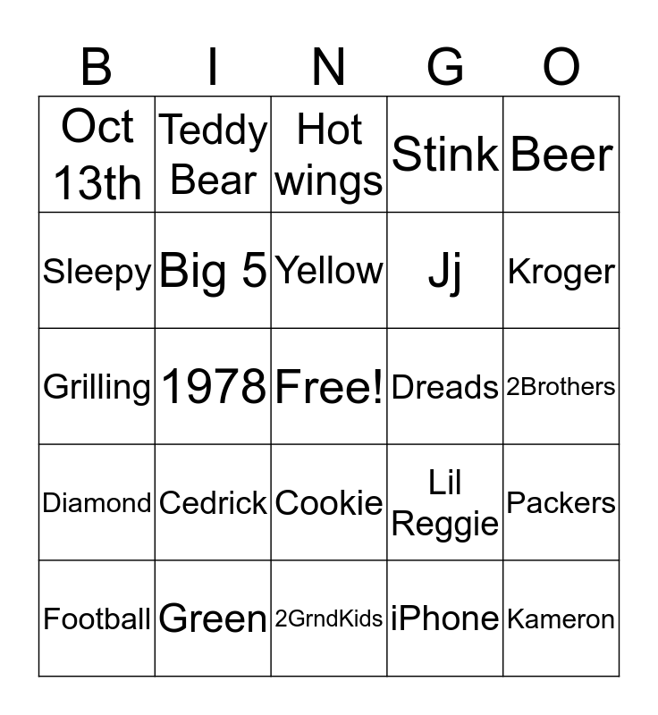 This bingo card has a free space and 29 words: 40th, Green, Hot wings, Beer, Beer, Oct 13th, Big 5, Yellow, Dreads, Packers, Football, 1978, iPhone, Kameron, Grilling, Carol, 2GrndKids, Lil Reggie, Kroger, Diamond, Cedrick, 1 Sister, Jj, 2Brothers, Sleepy, Teddy Bear, Cookie, Stink and Snoop.