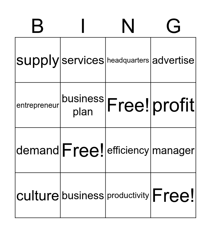 This bingo card has 16 words: business, manager, headquarters, supply, demand, services, efficiency, productivity, entrepreneur, business plan, culture, advertise, Free!, profit, Free! and Free!.
