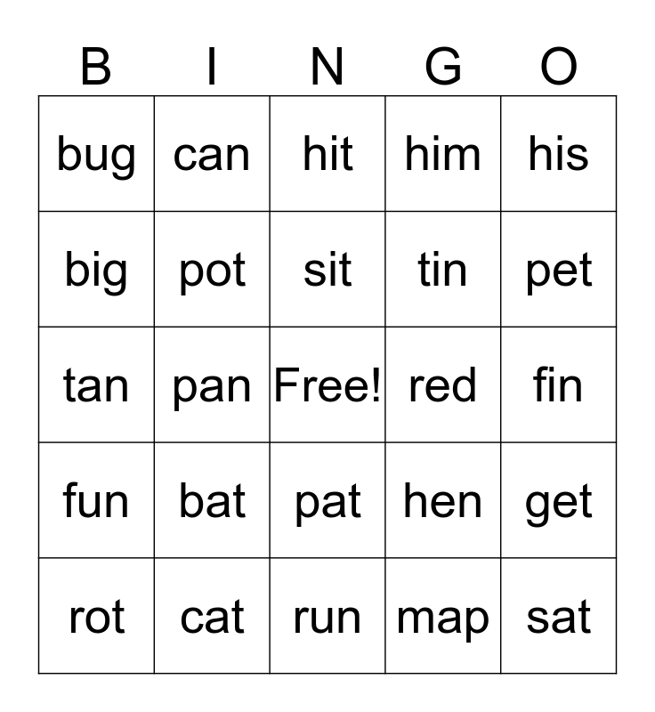 This bingo card has a free space and 24 words: bat, cat, sit, rot, his, bug, big, can, red, pat, tin, tan, hen, get, pot, map, fin, hit, pet, pan, sat, fun, him and run.