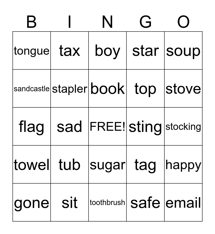 This bingo card has a free space and 24 words: tub, sit, book, gone, soup, tongue, sandcastle, tax, sting, sugar, top, flag, tag, happy, stapler, safe, stocking, boy, stove, sad, email, towel, star and toothbrush.
