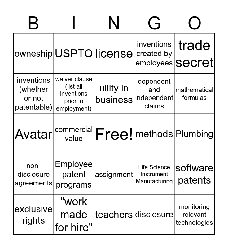 This bingo card has a free space and 53 words: tax strategy, Employee patent programs, Block Inventors, Employment agreement, software patents, fashion eyewear, USPTO, ideas, methods, "while utilizing Company equipment", owneship, fluid bed coating production process, assignment, disclosure, confidentiality agreement, non-disclosure agreements, commercial value, uility in business, confidential information, trade secret, inventions (whether or not patentable), "work made for hire", license, inventions created by employees, company resources, exclusive rights, Chakrabarty, Alice, natural phenomena, mathematical formulas, abstract ideas, "storehouse of knowledge", healthcare industry, government works, monitoring relevant technologies, handover clause, waiver clause (list all inventions prior to employment), method patent, dependent and independent claims, old pratcies, power plants, coal mines, teachers, wildfires, insurance industry, Avatar, drugs, gym, Life Science Instrument Manufacturing, Plumbing, Home Companion Care, Arts and crafts and quilting.