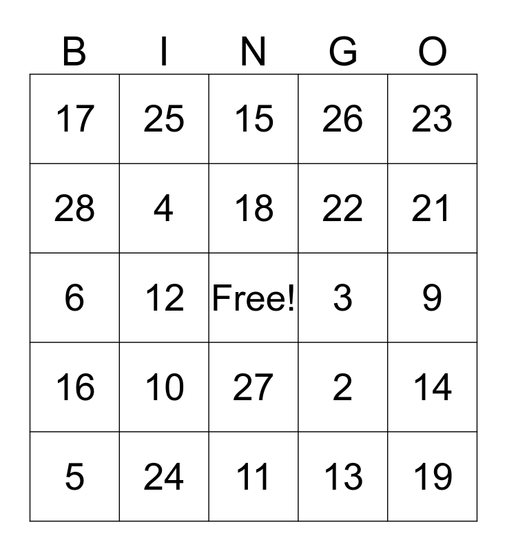 This bingo card has a free space and 29 words: 7, 24, 15, 8, 23, 17, 4, 18, 3, 14, 5, 12, 13, 19, 6, 1, 11, 2, 21, 16, 10, 20, 22, 9, 28, 25, 27, 26 and 29.