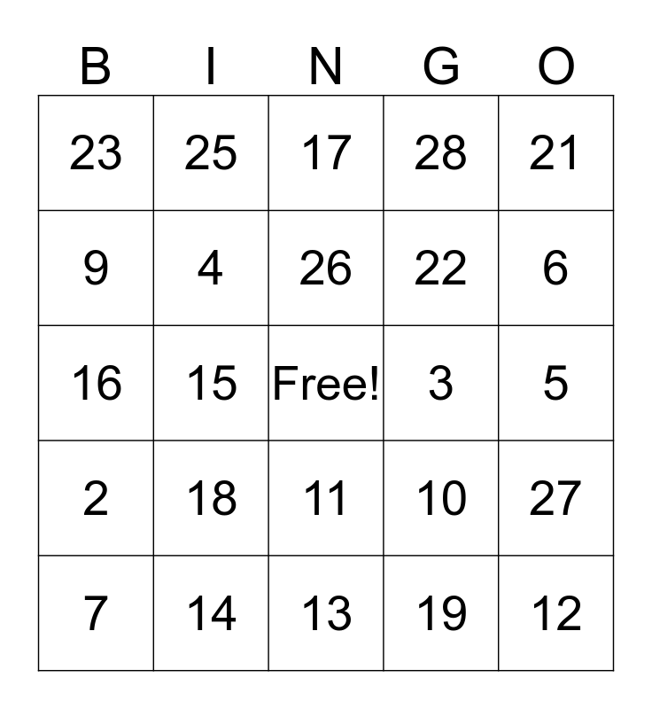This bingo card has a free space and 29 words: 7, 24, 15, 8, 23, 17, 4, 18, 3, 14, 5, 12, 13, 19, 6, 1, 11, 2, 21, 16, 10, 20, 22, 9, 28, 25, 27, 26 and 29.