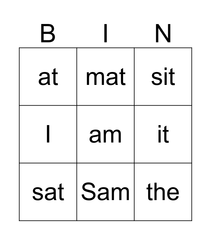 This bingo card has a free space and 8 words: it, sit, mat, sat, at, the, I and Sam.