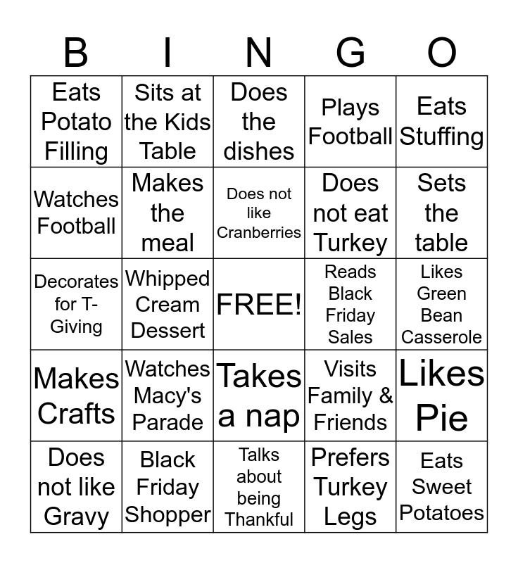 This bingo card has a free space and 24 words: Watches Macy's Parade, Black Friday Shopper, Does not like Cranberries, Does not like Gravy, Eats Stuffing, Eats Potato Filling, Watches Football, Sits at the Kids Table, Reads Black Friday Sales, Takes a nap, Does not eat Turkey, Decorates for T-Giving, Visits Family & Friends, Likes Pie, Makes the meal, Prefers Turkey Legs, Likes Green Bean Casserole, Does the dishes, Sets the table, Whipped Cream Dessert, Eats Sweet Potatoes, Makes Crafts, Plays Football and Talks about being Thankful.