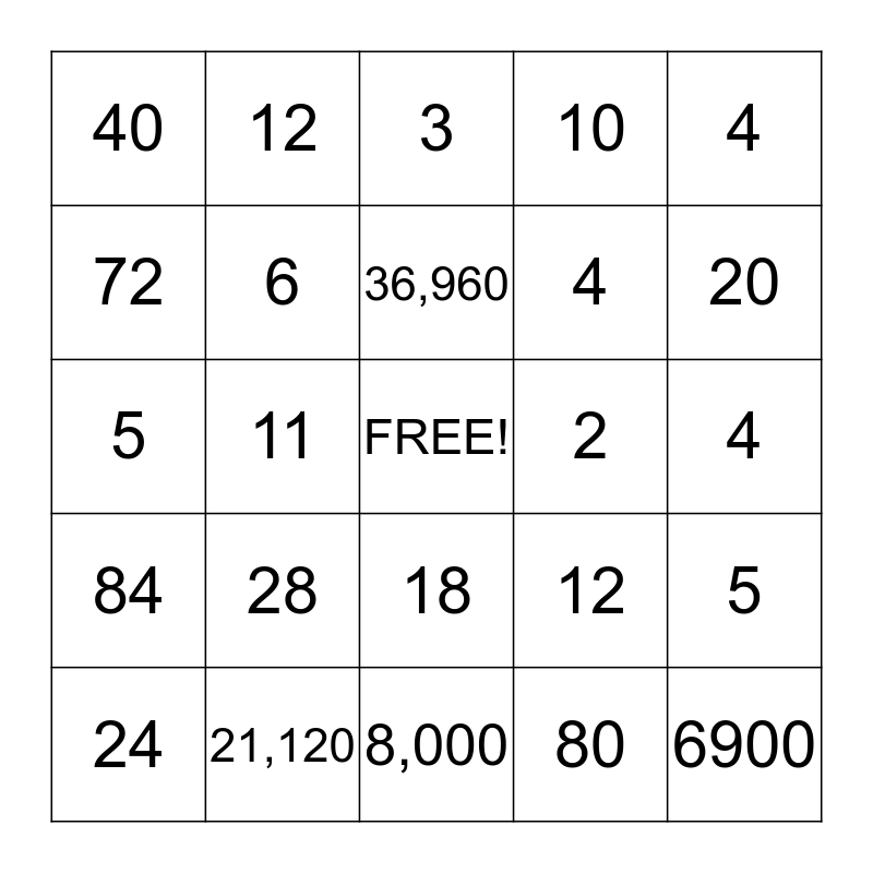 This bingo card has a free space and 28 words: 5, 15, 4, 80, 72, 3, 12, 84, 2, 24, 5, 10, 21,120, 8,000, 20, 8, 28, 6, 36,960, 18, 40, 300, 6900, 11, 4, 12, 4 and 12.