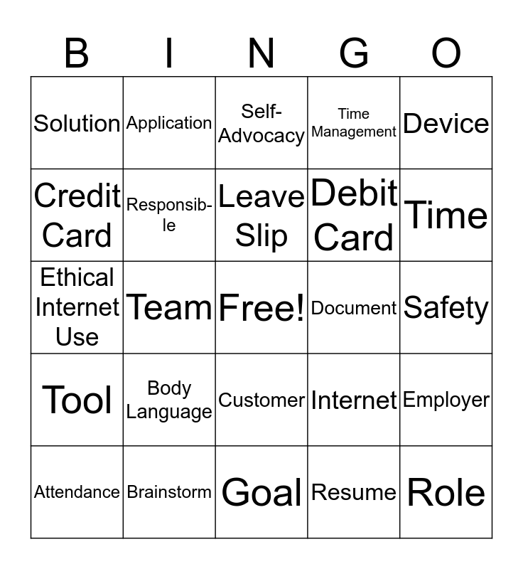 This bingo card has a free space and 29 words: Attendance, Respect, Team, Dress Code, Solution, Self-Advocacy, Responsib-le, Body Language, Document, Brainstorm, Safety, Role, Goal, Resume, Time, Salary, Customer, Tool, Device, Ethical Internet Use, Internet, Check, Debit Card, Credit Card, Time Management, Application, Employer, Leave Slip and Disability.