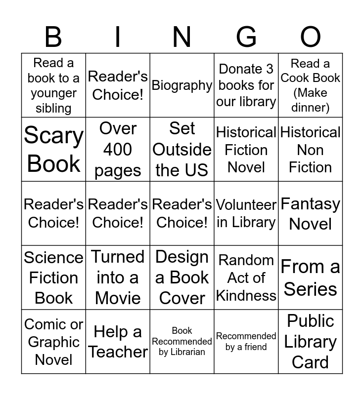 This bingo card has 25 words: Turned into a Movie, Book Recommended by Librarian, Set Outside the US, Comic or Graphic Novel, Read a Cook Book (Make dinner), Read a book to a younger sibling, Scary Book, Reader's Choice!, Volunteer in Library, Design a Book Cover, Historical Fiction Novel, Reader's Choice!, Random Act of Kindness, From a Series, Over 400 pages, Public Library Card, Fantasy Novel, Biography, Historical Non Fiction, Reader's Choice!, Reader's Choice!, Help a Teacher, Science Fiction Book, Donate 3 books for our library and Recommended by a friend.