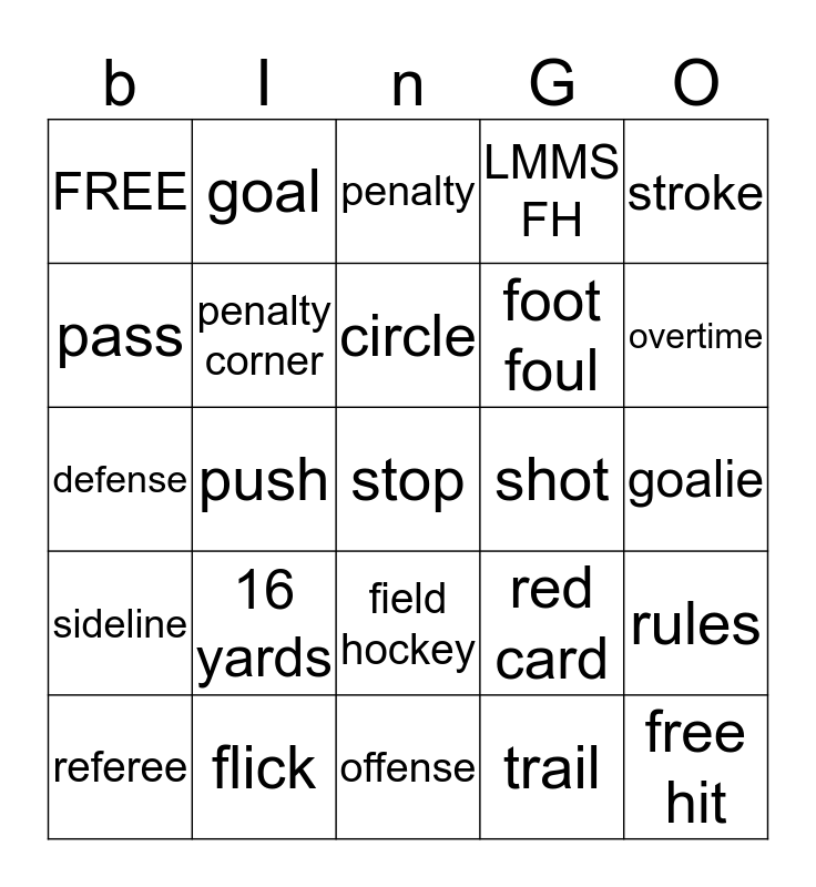 This bingo card has a free space and 29 words: referee, hockey ball, push, obstruction, FREE, penalty, penalty corner, 16 yards, shot, flick, goalie, free hit, offense, trail, overtime, fly, field hockey, sideline, stroke, defense, red card, attacker, foot foul, pass, LMMS FH, goal, rules, circle and scoop.