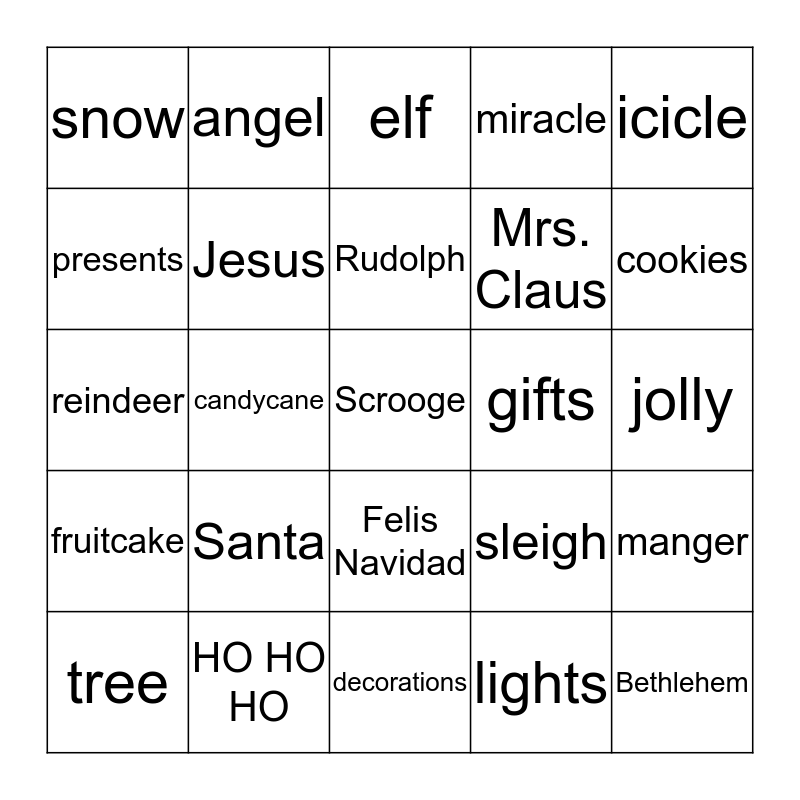 This bingo card has 25 words: Santa, decorations, Rudolph, tree, icicle, snow, presents, angel, gifts, Felis Navidad, Mrs. Claus, reindeer, sleigh, manger, Jesus, Bethlehem, jolly, elf, cookies, candycane, Scrooge, HO HO HO, fruitcake, miracle and lights.
