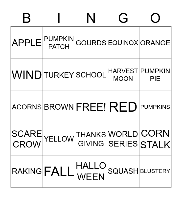 This bingo card has a free space and 24 words: YELLOW, FALL, SCHOOL, RAKING, ORANGE, APPLE, WIND, PUMPKIN PATCH, RED, THANKS GIVING, HARVEST MOON, ACORNS, WORLD SERIES, CORN STALK, TURKEY, SQUASH, PUMPKINS, GOURDS, PUMPKIN PIE, BROWN, BLUSTERY, SCARE CROW, EQUINOX and HALLO WEEN.