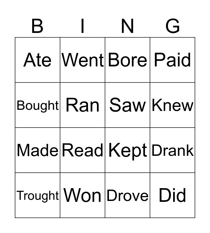 This bingo card has 19 words: Kept, Was, Bore, Did, Drank, Bought, Drove, Ate, Went, Made, Read, Ran, Saw, Won, Trought, Said, Paid, Knew and Got.