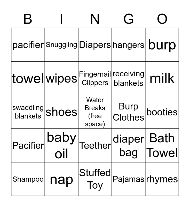 This bingo card has a free space and 61 words: bassinet, nap, Bottle, Pacifier, Pajamas, Monitor, wipes, mittens, receiving blankets, thermometer, hangers, bathtub, towel, tub, lullaby, pacifier, rhymes, burp, cradle, Fingernail Clippers, Burp Clothes, Diapers, Shampoo, Bath Towel, Hair Bow, bib, bottle, crayon, milk, napkin, Washcloth, Desitin, Diapers, Crib, Snuggling, Bumbo Seat, safety pin, shoes, spoon, swaddling blankets, baby powder, baby oil, booties, nasal aspirator, diaper bag, toy, White Onsie, Homeade Quilt, Rattle, Teether, Stuffed Toy, Blanket, Hat, Bibs, Poopy Diapers, Lotion, bottle washer, Pink Onsie, Shoes, Socks and Dress.