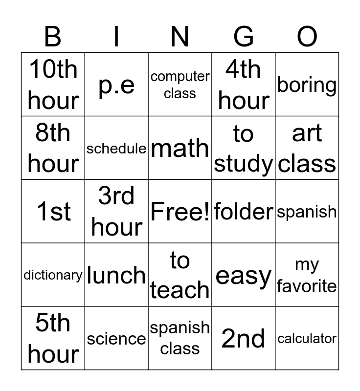 This bingo card has a free space and 24 words: lunch, science, math, 5th hour, boring, 10th hour, 8th hour, p.e, folder, to teach, to study, 1st, easy, my favorite, schedule, 2nd, spanish, computer class, art class, 3rd hour, calculator, dictionary, 4th hour and spanish class.