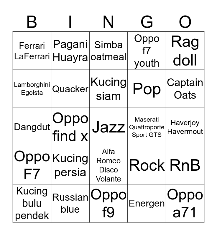 This bingo card has a free space and 24 words: Kucing persia, Russian blue, Kucing siam, Kucing bulu pendek, Rag doll, Ferrari LaFerrari, Lamborghini Egoista, Pagani Huayra, Maserati Quattroporte Sport GTS, Alfa Romeo Disco Volante, Pop, Dangdut, Rock, RnB, Quacker, Energen, Haverjoy Havermout, Simba oatmeal, Captain Oats, Oppo find x, Oppo a71, Oppo F7, Oppo f7 youth and Oppo f9.