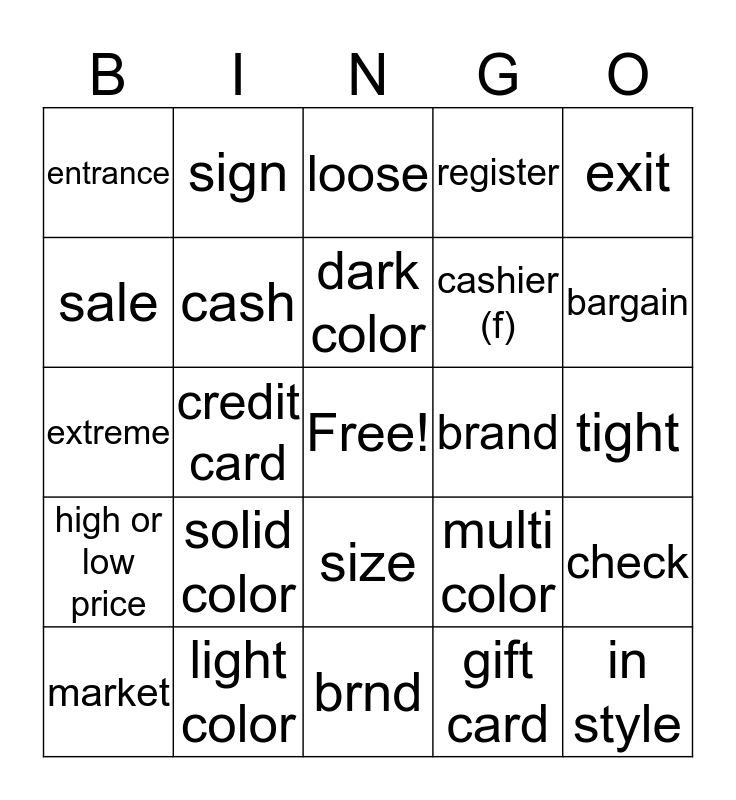 This bingo card has a free space and 24 words: solid color, light color, dark color, market, exit, entrance, sale, sign, brand, size, cashier (f), extreme, multi color, check, cash, gift card, tight, loose, bargain, credit card, in style, high or low price, register and brnd.