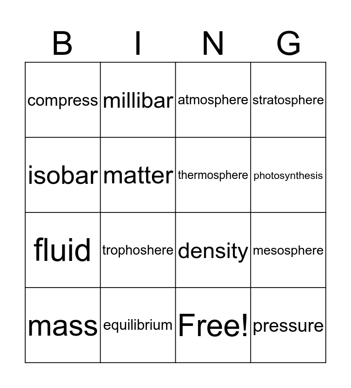 This bingo card has 17 words: Free!, mass, atmosphere, compress, trophoshere, stratosphere, mesosphere, thermosphere, photosynthesis, matter, equilibrium, density, isobar, millibar, fluid, kinetic energy and pressure.