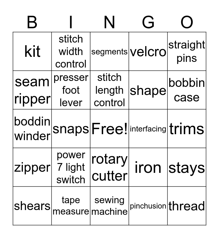 This bingo card has a free space and 24 words: power 7 light switch, tape measure, stitch length control, shears, straight pins, kit, seam ripper, stitch width control, interfacing, rotary cutter, shape, boddin winder, iron, stays, presser foot lever, pinchusion, trims, segments, bobbin case, snaps, thread, zipper, velcro and sewing machine.