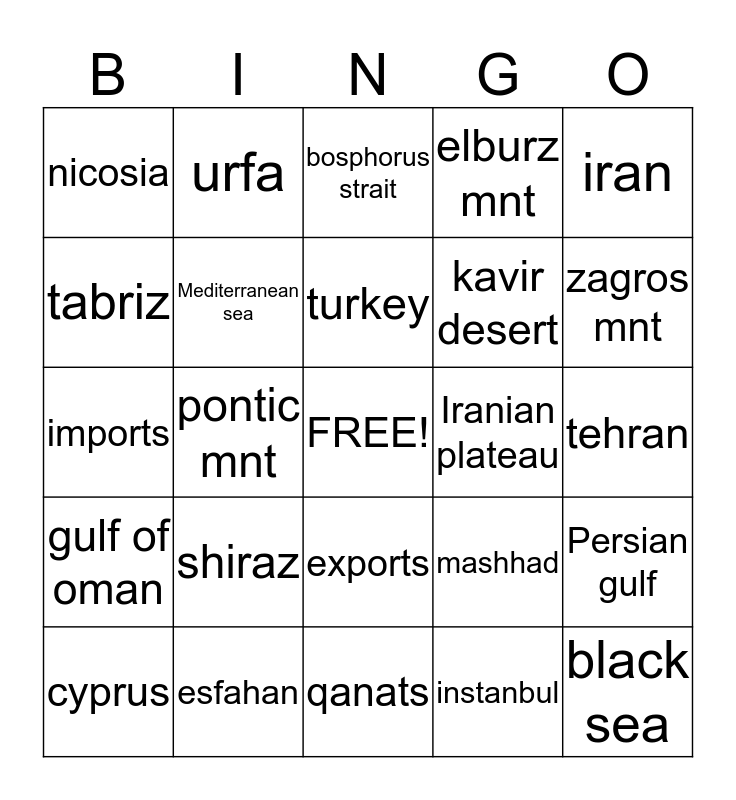 This bingo card has a free space and 24 words: shiraz, esfahan, turkey, cyprus, iran, nicosia, tabriz, urfa, Iranian plateau, exports, kavir desert, imports, mashhad, Persian gulf, Mediterranean sea, instanbul, tehran, bosphorus strait, zagros mnt, pontic mnt, black sea, gulf of oman, elburz mnt and qanats.