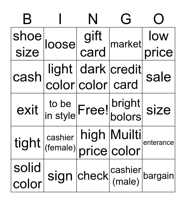 This bingo card has a free space and 27 words: Muilti color, cash register, credit card, check, cash, gift card, loose, tight, bright bolors, enterance, exit, market, solid color, sign, sale, brand, light color, dark color, cashier (female), shoe size, size, cashier (male), to be in style, bargain, high price, low price and extreme.