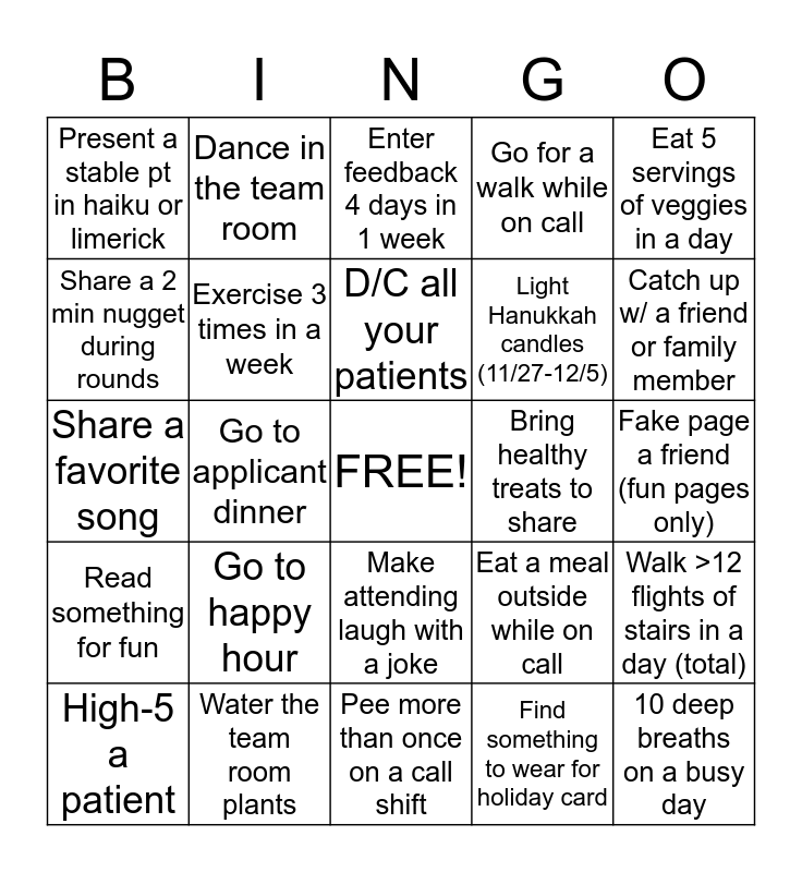 This bingo card has a free space and 24 words: Go to happy hour, Water the team room plants, D/C all your patients, High-5 a patient, Eat 5 servings of veggies in a day, Present a stable pt in haiku or limerick, Share a 2 min nugget during rounds, Dance in the team room, Bring healthy treats to share, Make attending laugh with a joke, Light Hanukkah candles (11/27-12/5), Share a favorite song, Eat a meal outside while on call, Walk >12 flights of stairs in a day (total), Exercise 3 times in a week, Find something to wear for holiday card, Fake page a friend (fun pages only), Enter feedback 4 days in 1 week, Catch up w/ a friend or family member, Go to applicant dinner, 10 deep breaths on a busy day, Read something for fun, Go for a walk while on call and Pee more than once on a call shift.