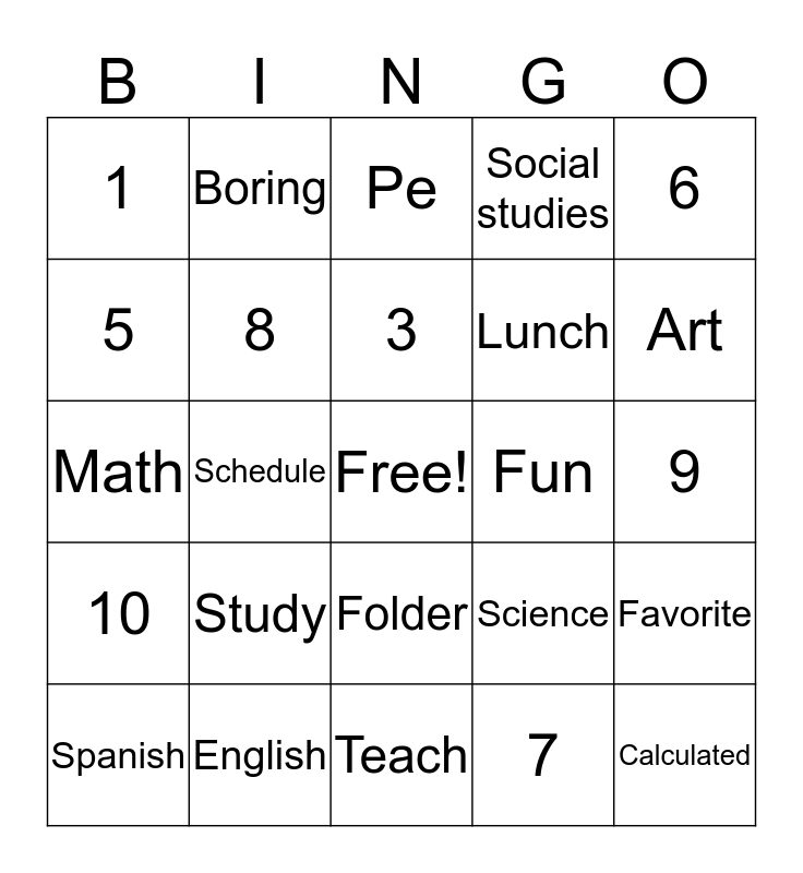 This bingo card has a free space and 24 words: Study, English, 3, Spanish, 6, 1, 5, Boring, Fun, Folder, Lunch, Math, Science, Favorite, 8, 7, 9, Pe, Art, Schedule, Calculated, 10, Social studies and Teach.