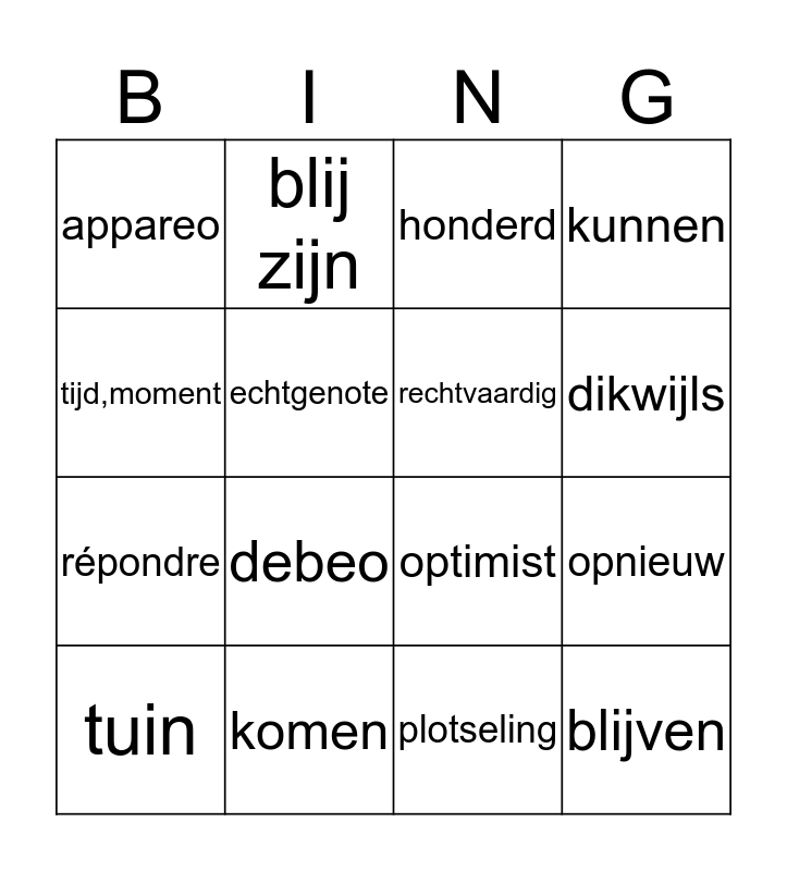 This bingo card has 24 words: paard, sen- m, dikwijls, ook, tijd,moment, appareo, echtgenote, blij zijn, komen, waarom, répondre, optimist, vrolijk, bang, rechtvaardig, geheel, plotseling, honderd, debeo, opnieuw, tuin, blijven, kunnen and zeker.